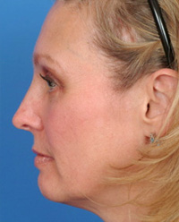 Lateral view: Notice the postoperative view has the eyebrow arching right above the eye socket. This patient also underwent a chin implant to improve her lower facial profile.